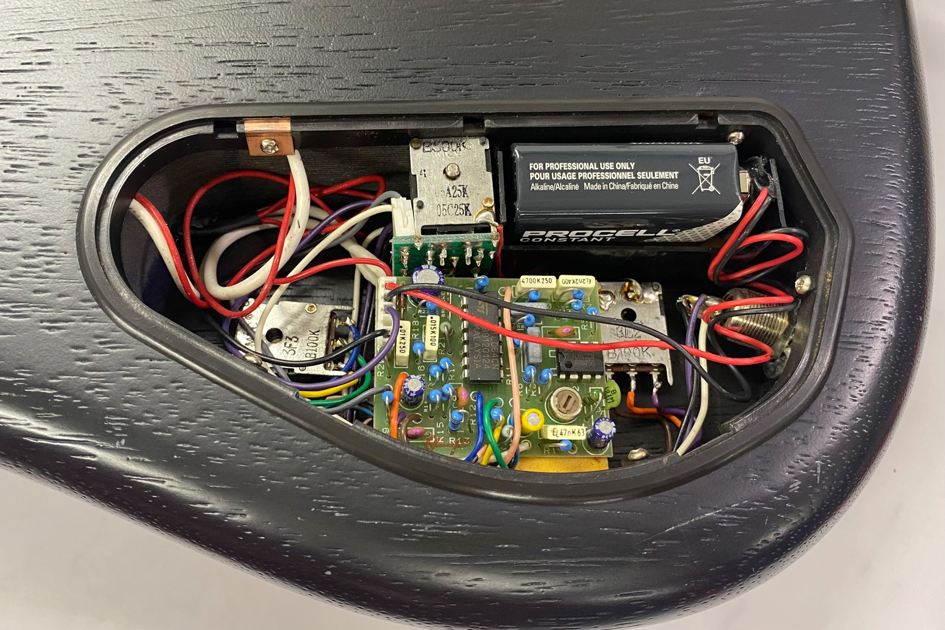 The pickups are the familiar Active MEC J/J pickups, and the preamp is original.