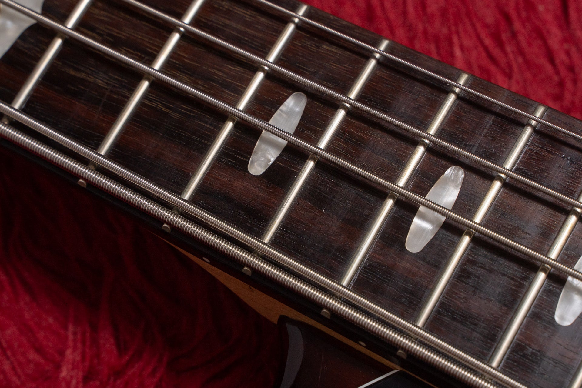 The neck is a 5-piece laminate of maple and Nyatoh, and the fingerboard is rosewood.