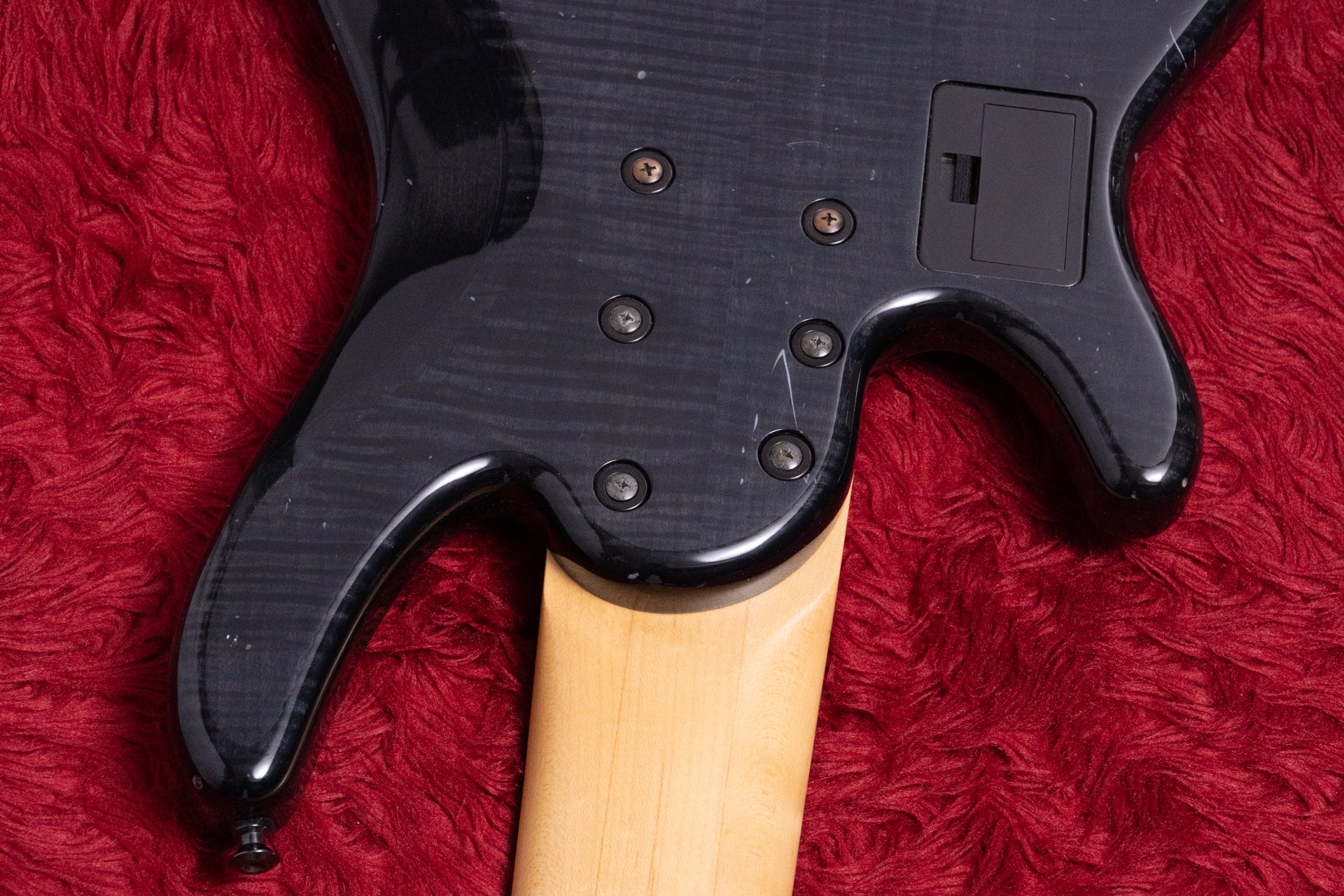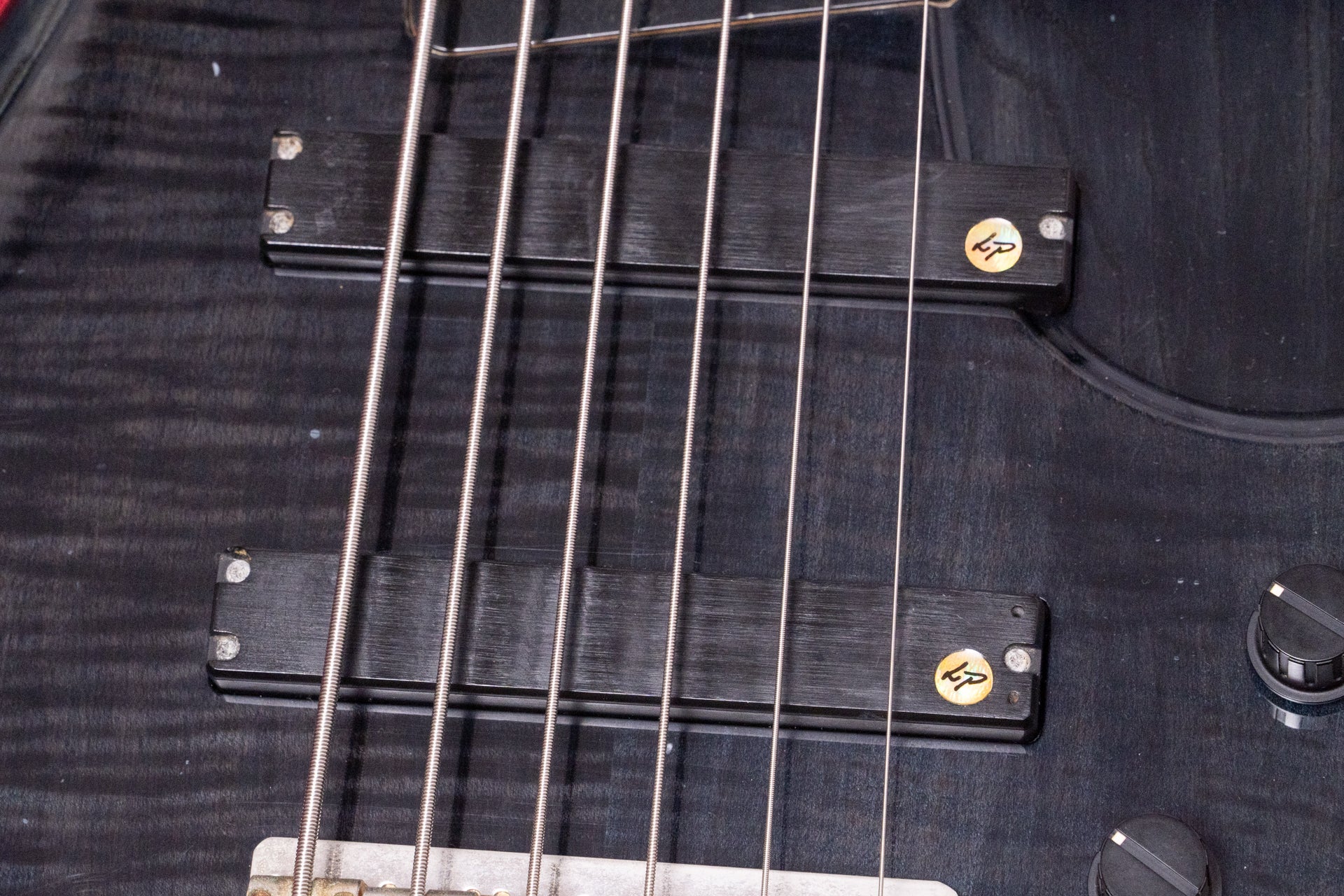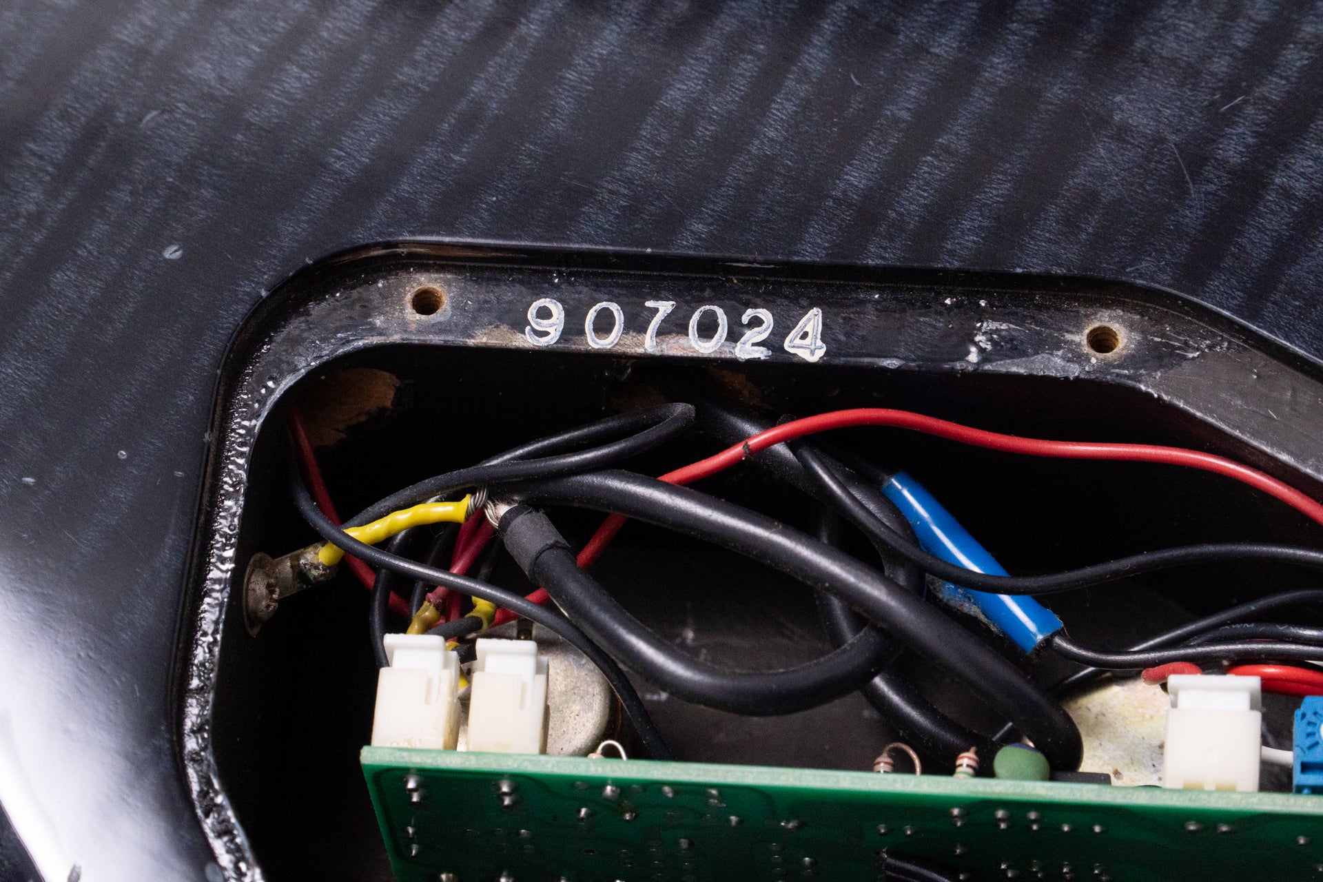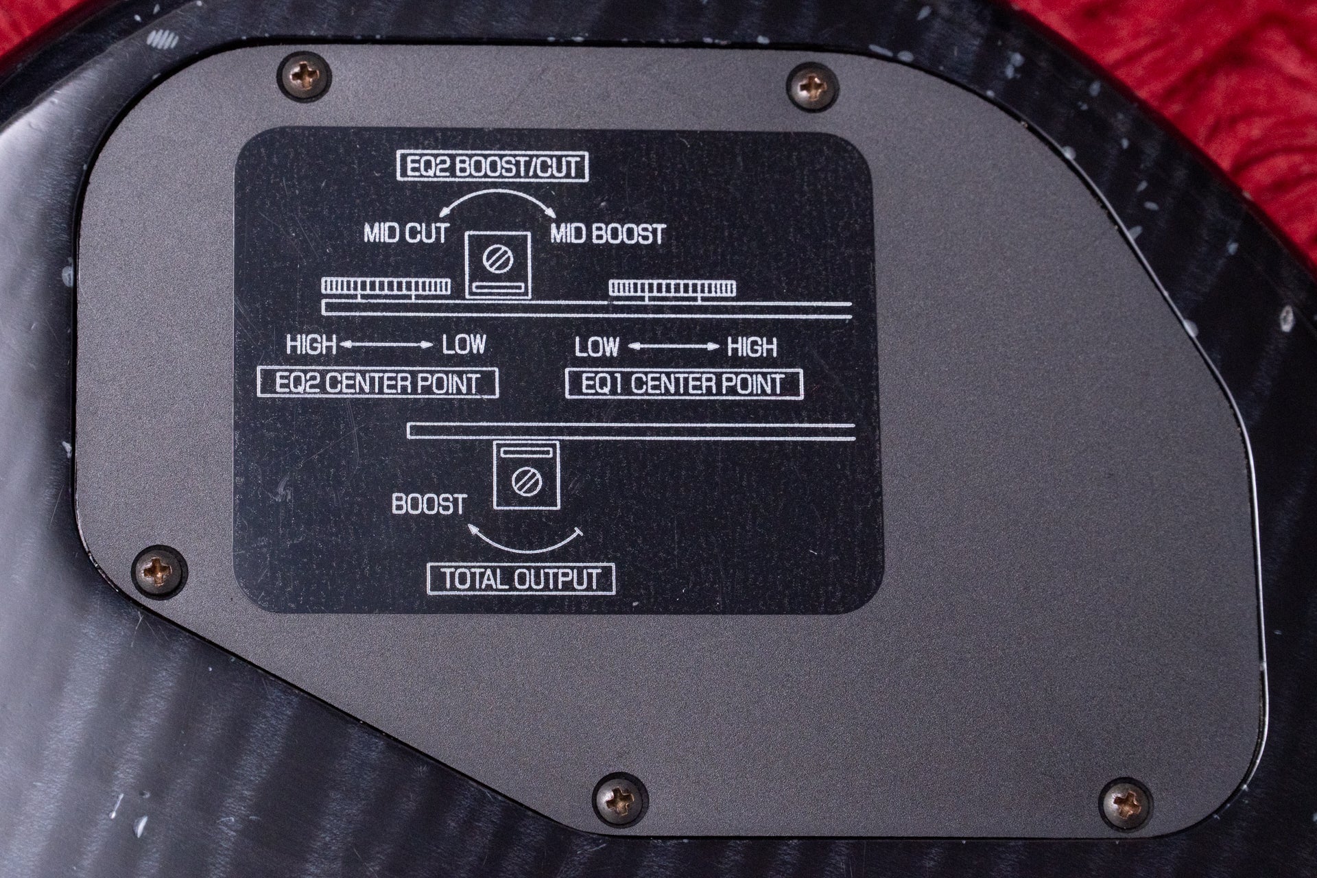 Controls: Balancer, master volume, bass, middle switch (EQ2, EQ1, OFF), treble, preamp gain (inside cavity), EQ2 Boost/Cut (inside cavity), EQ2 middle frequency (inside cavity), EQ1 middle frequency (inside cavity)