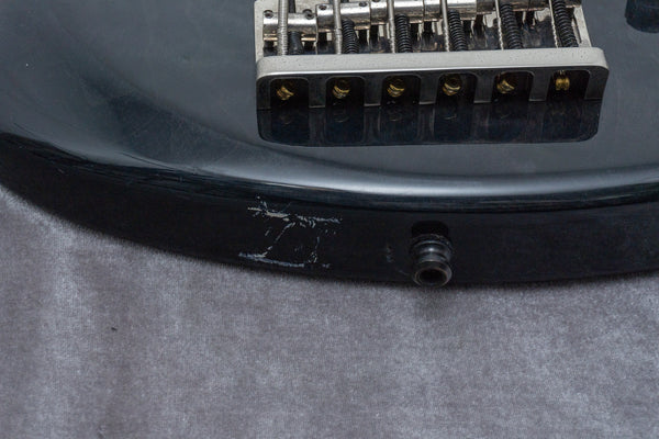 The body and finish show overall scratches and dents. Metal hardware exhibits tarnish.