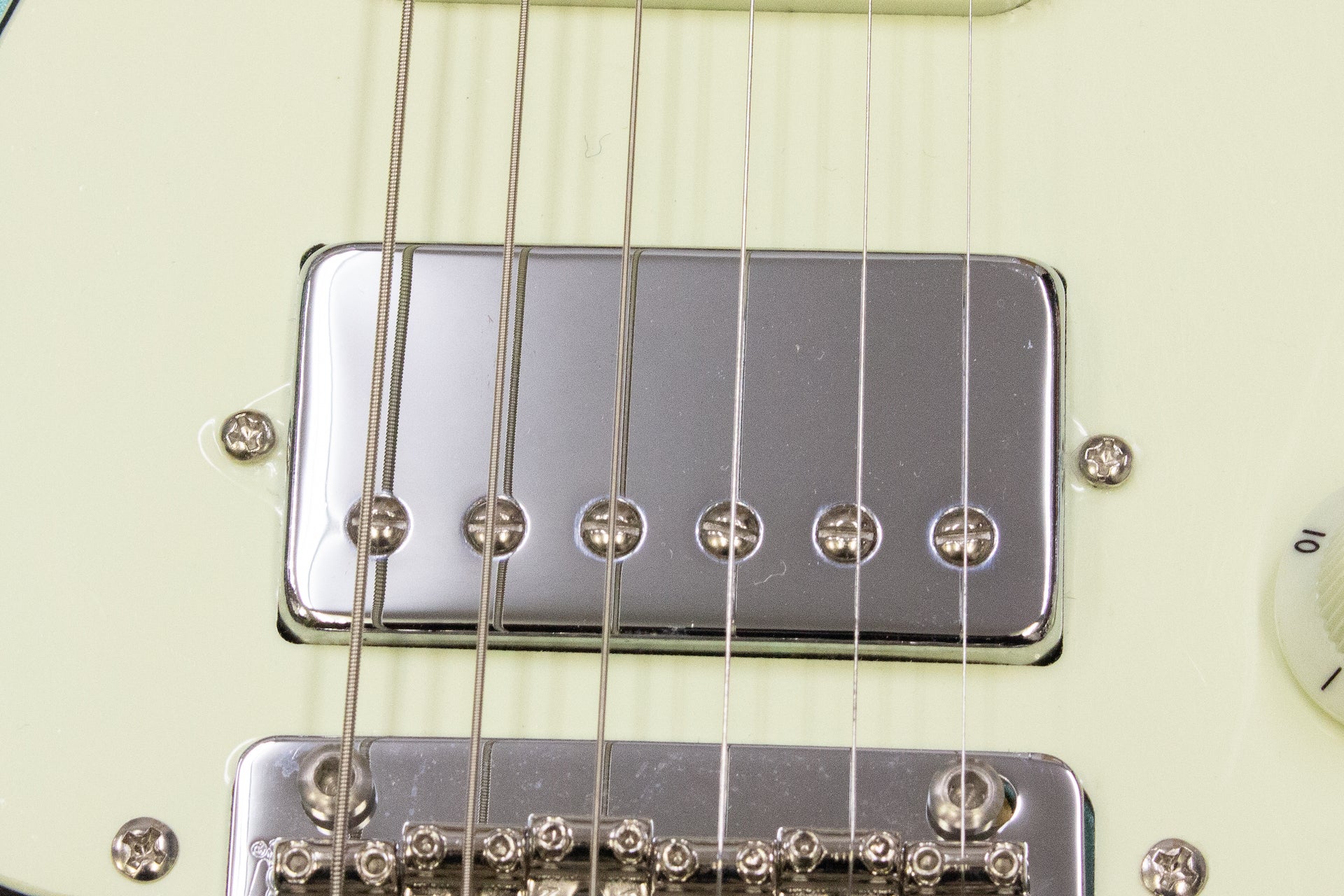 The pickups are a modern style, with the rear of the conventional 3-single replaced by a humbucking type.