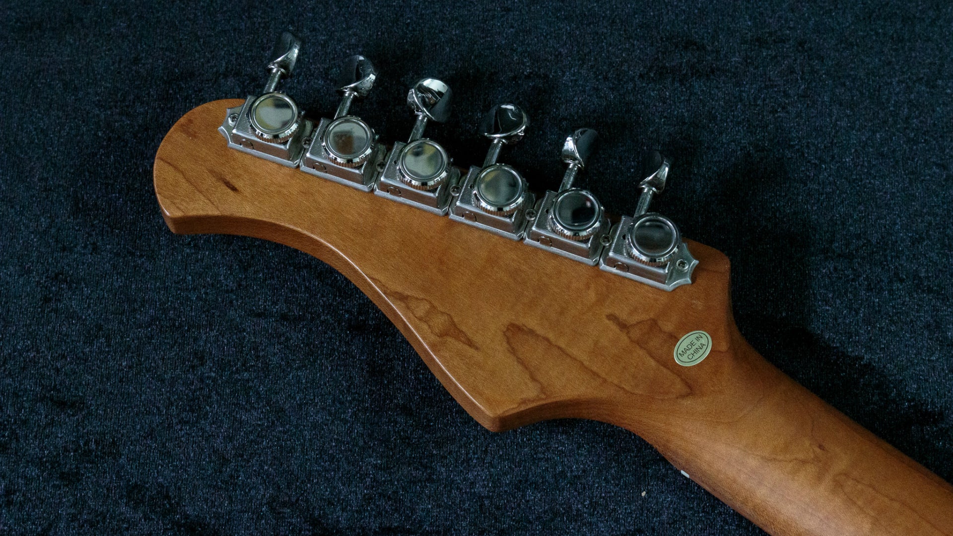 The tuning keys are locking type for high stability, and the bridge features a two-point tremolo unit for smooth arming.