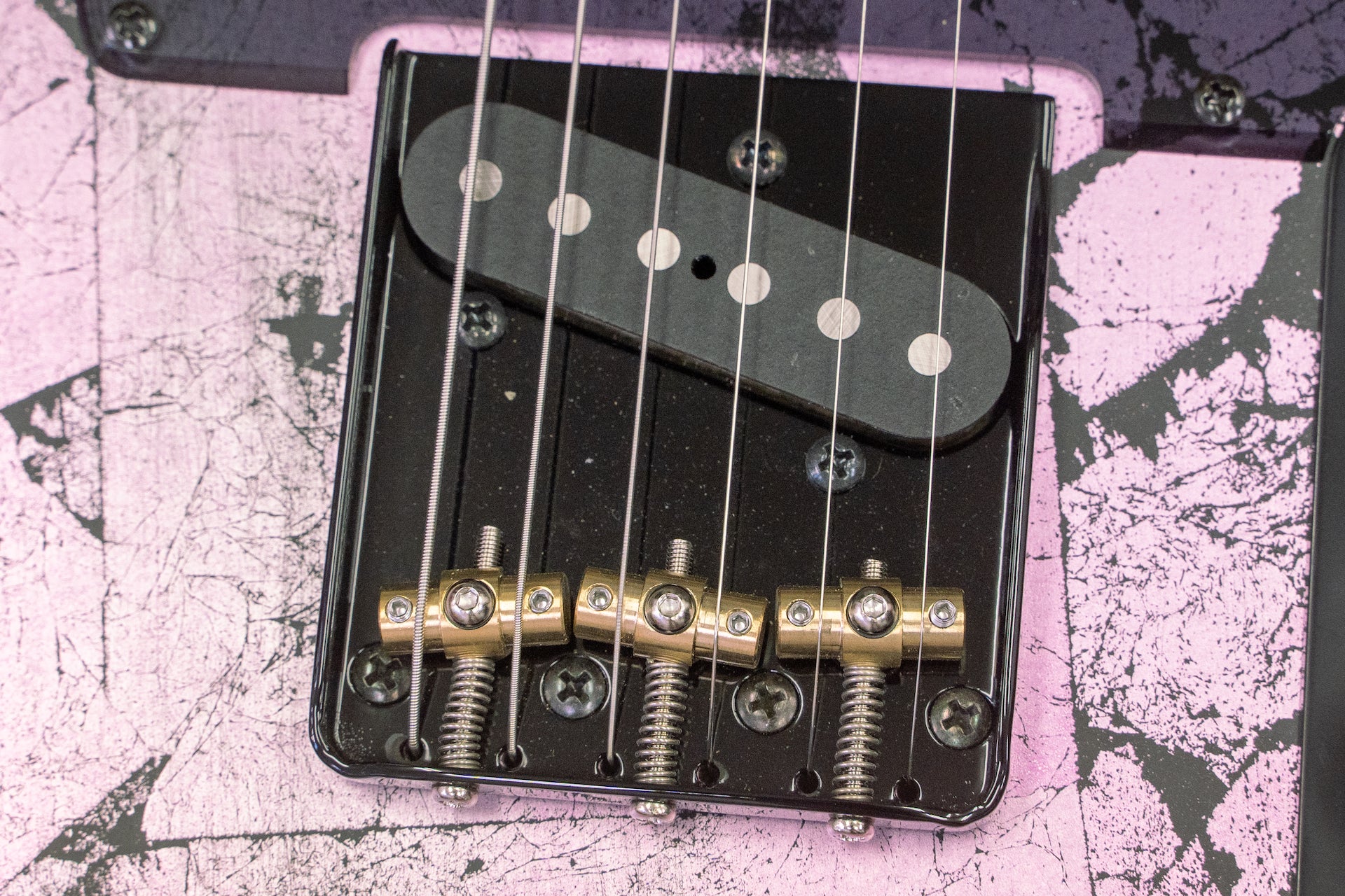 The bridge looks like a traditional Telecaster type bridge, but with a cutout in the wall on the first string side of the plate to reduce interference between the plate and your hand during chord strokes and cutting, allowing stress-free picking.