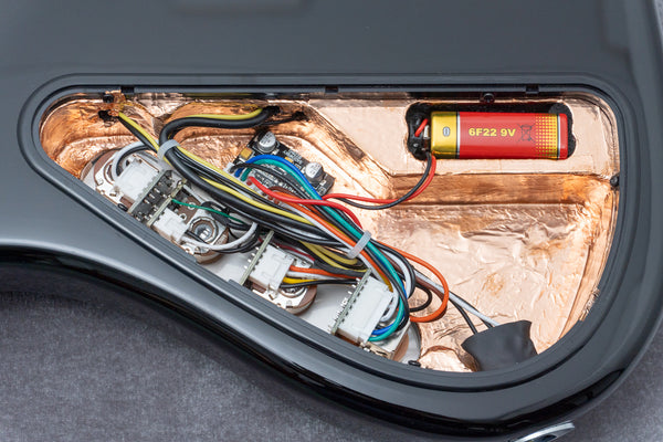 Looking inside the cavity, you'll see copper foil tape applied for shielding. Excellent.