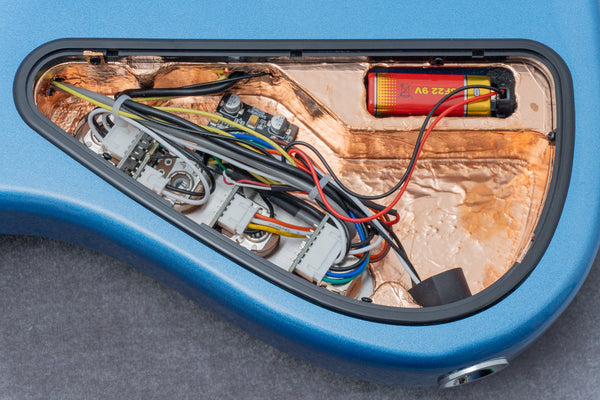 Looking inside the cavity, you'll see copper foil tape applied for shielding. Excellent.