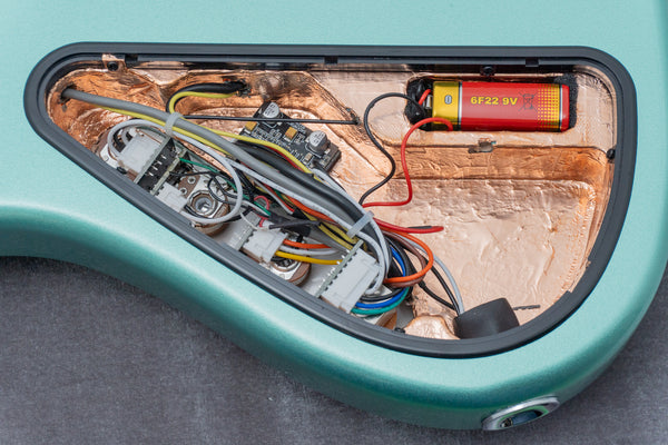 Looking inside the cavity, you'll see copper foil tape applied for shielding. Excellent.