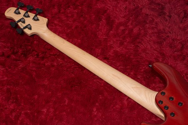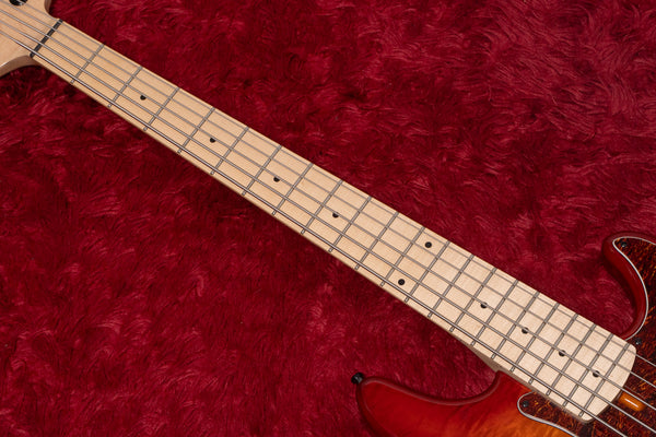 The scale is 0.5 inches longer than usual to achieve tighter bass strings, resulting in a stronger fundamental tone.