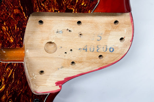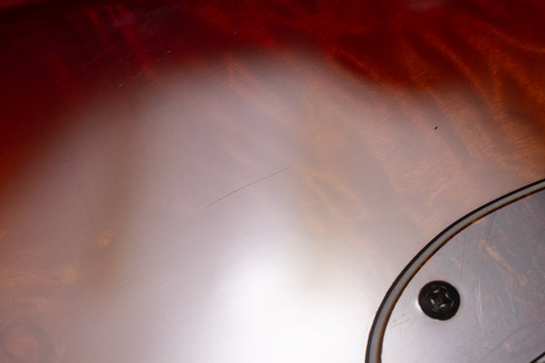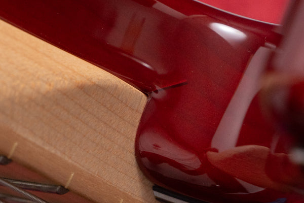 The body and finish show scattered scratches and dents. There is dirt and sun damage on the side of the neck, likely caused by luminous tape.