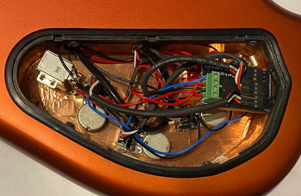 Controls: Volume (push/pull - active/passive), bass, middle, treble, PU wiring selector switch (series/tap/parallel)