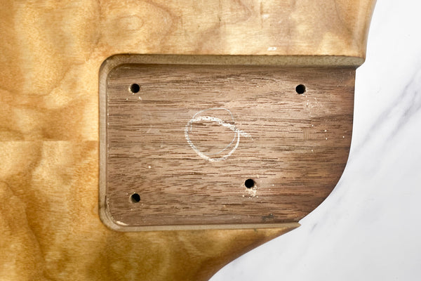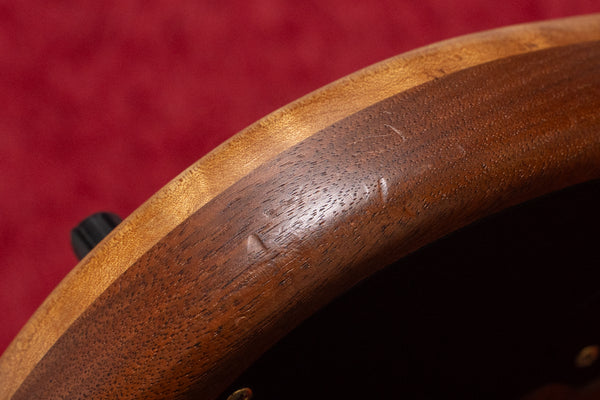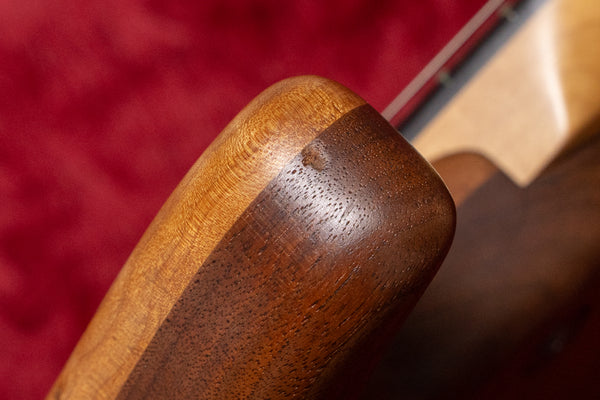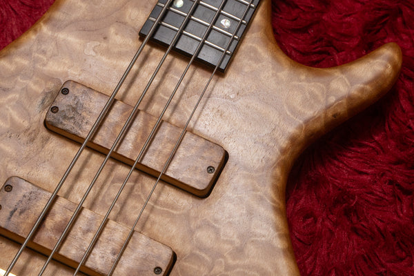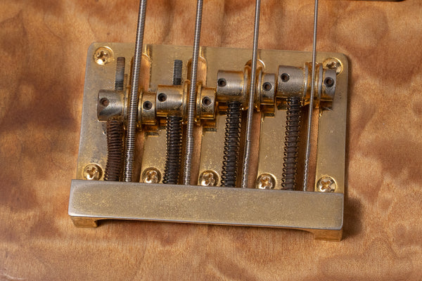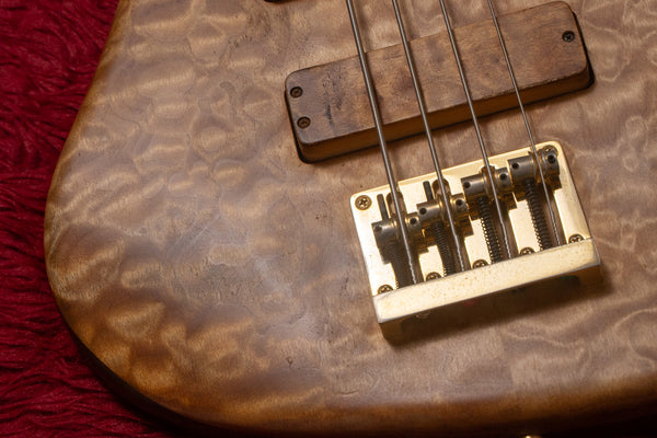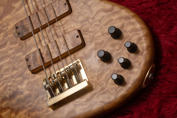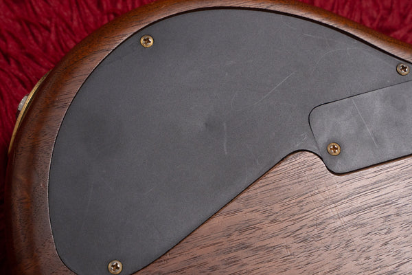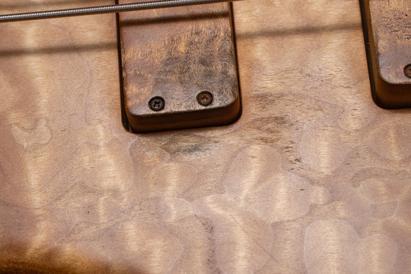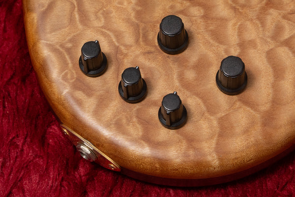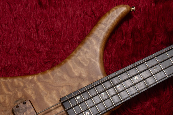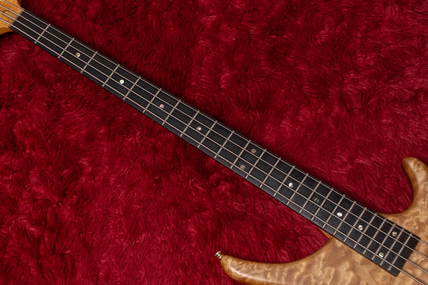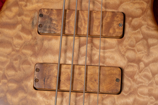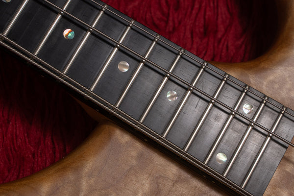 The body top is quilted maple, the back is likely mahogany, and the fingerboard is ebony.