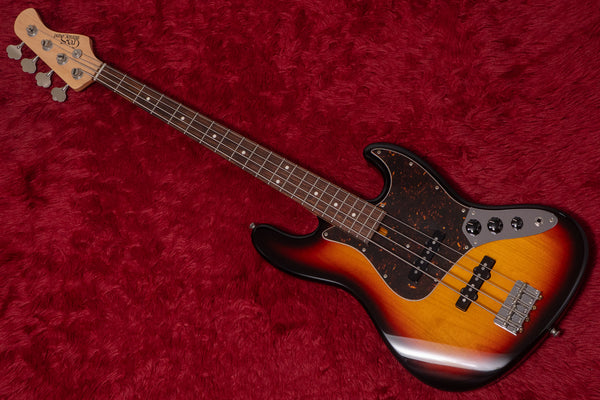 The body is made of alder and the fingerboard is made of rosewood, a classic construction.