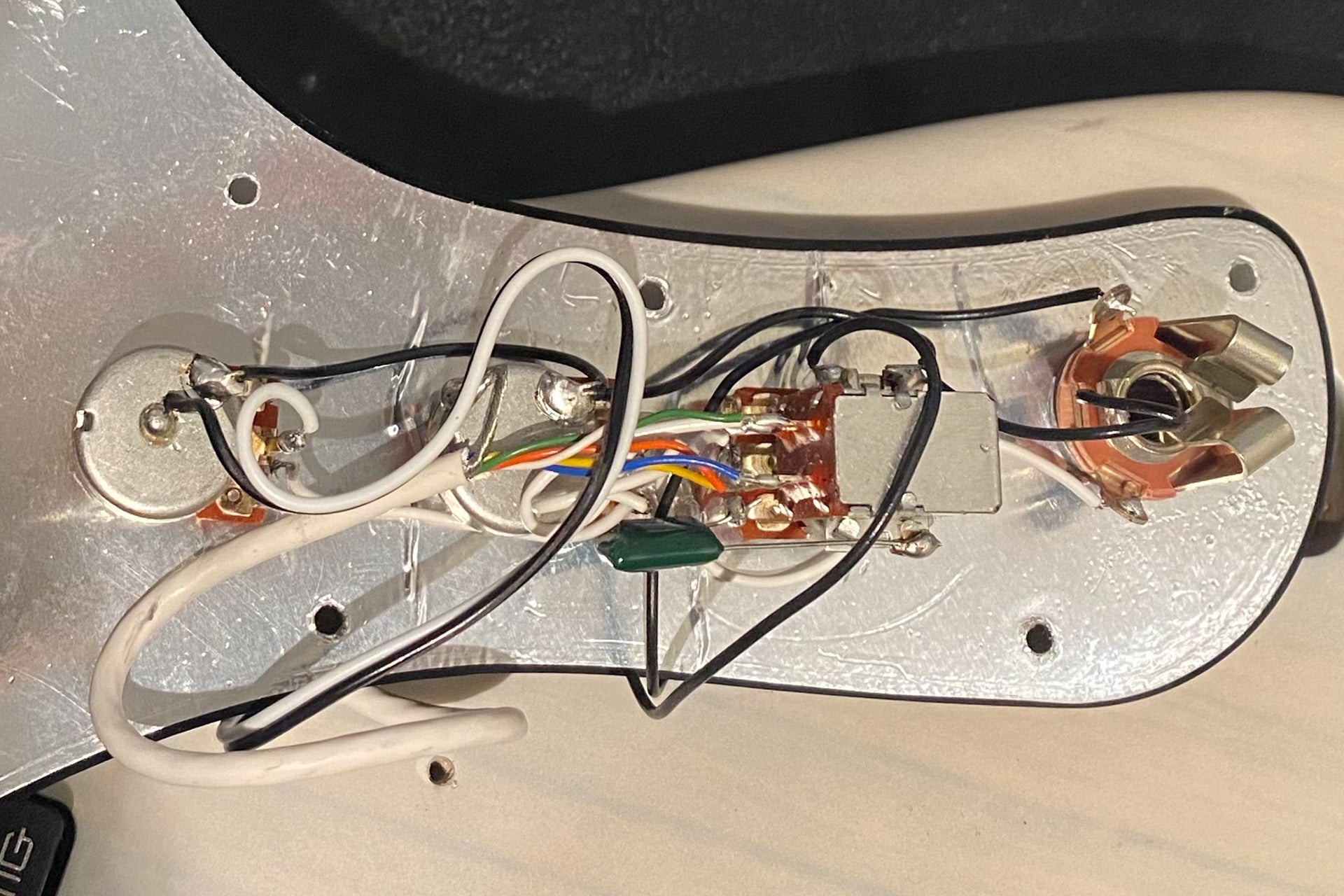 The battery box and jack have been replaced. One pickguard mounting screw has been replaced.
