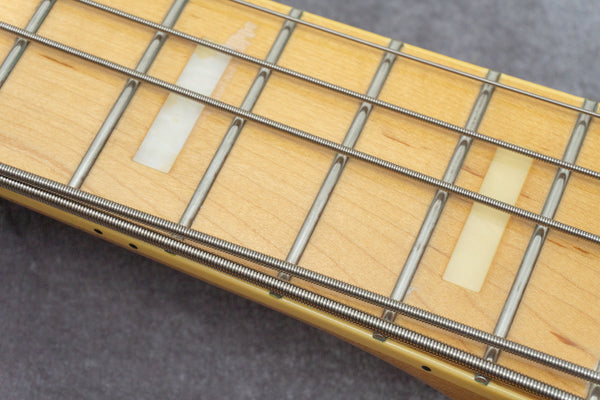 The body and finish show scattered minor scratches, but no significant damage. There is some finish peeling on the fingerboard at the 9th and 12th frets.