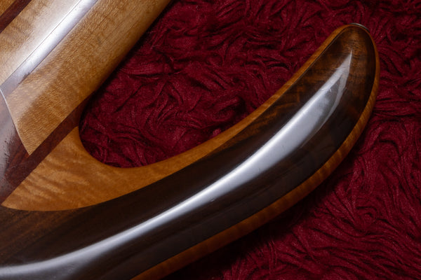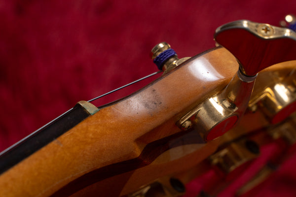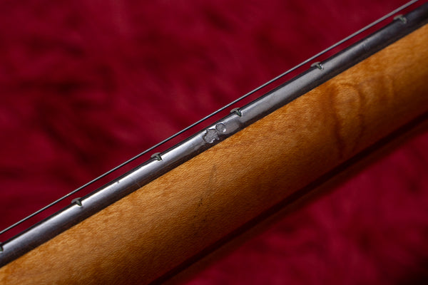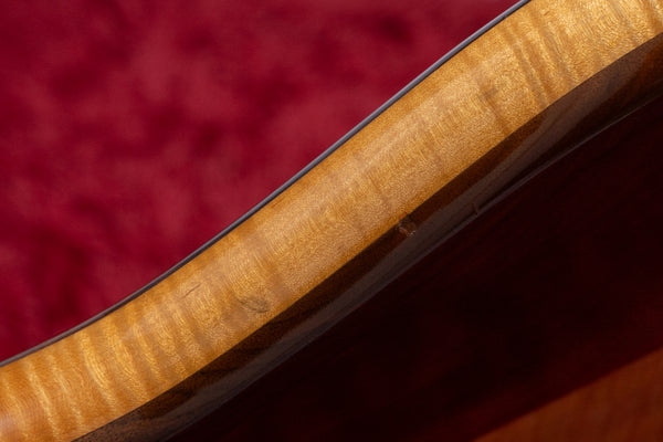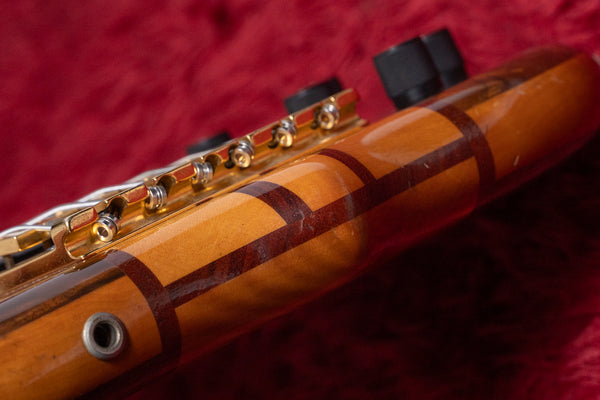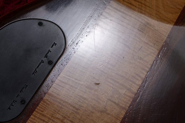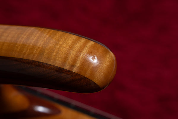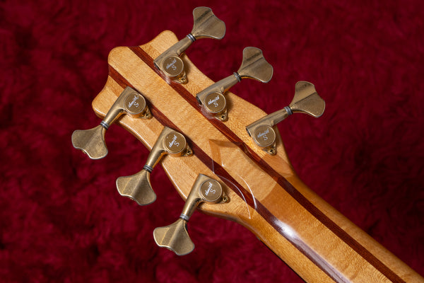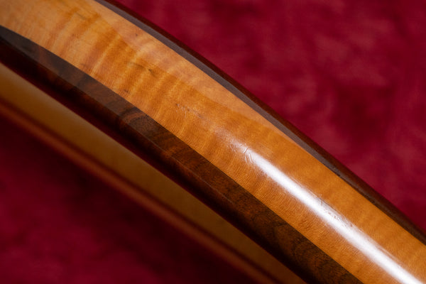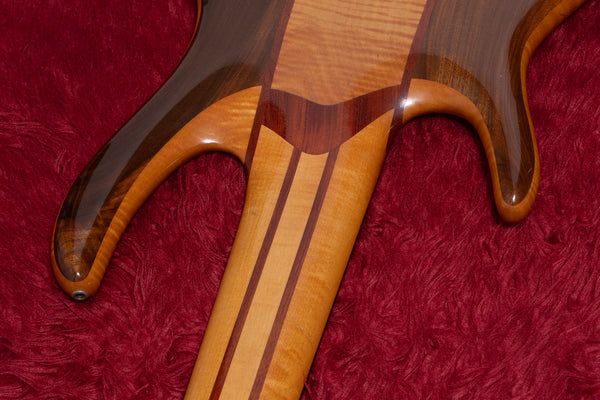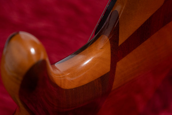 The neck is a five-piece laminate made primarily of maple, and the fingerboard is ebony.