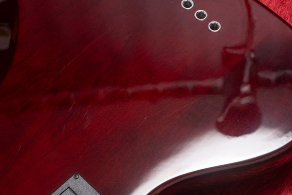 The body is alder and the fingerboard is ebony, a slightly more modern design.