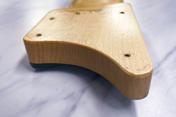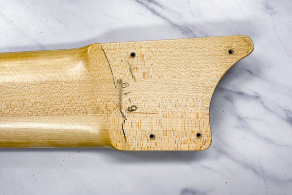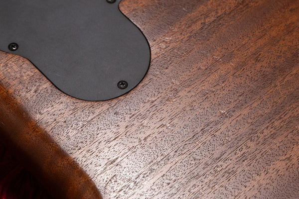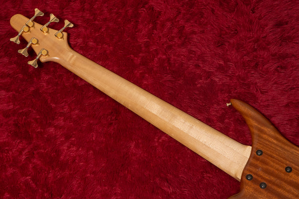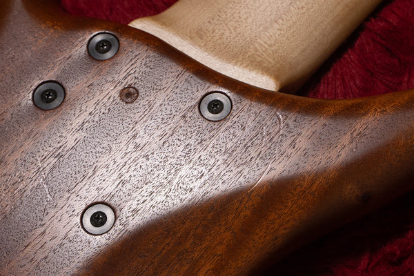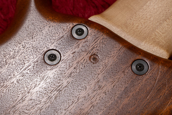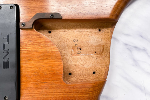 The body back is mahogany, the neck is a three-piece maple neck, and the fingerboard is ebony, a typical TUNE configuration.