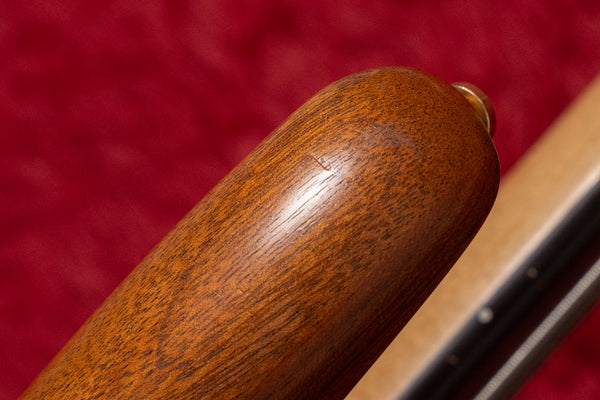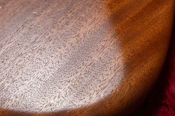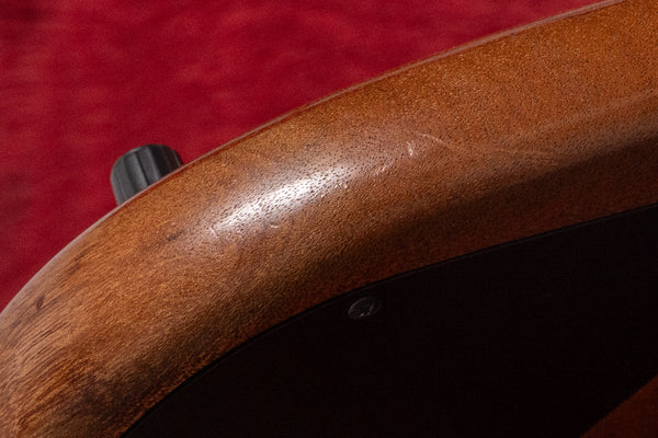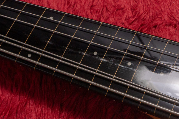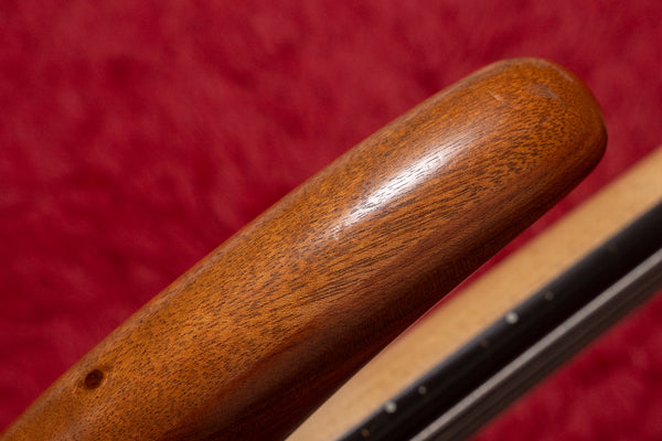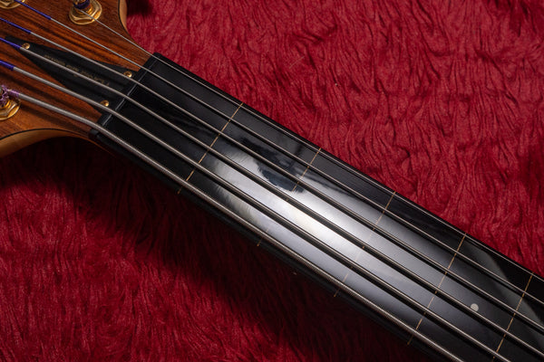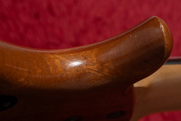 This instrument was originally fretted but has been converted to fretless. The nut has likely been replaced, and a finger rest and finger lamp have been installed.