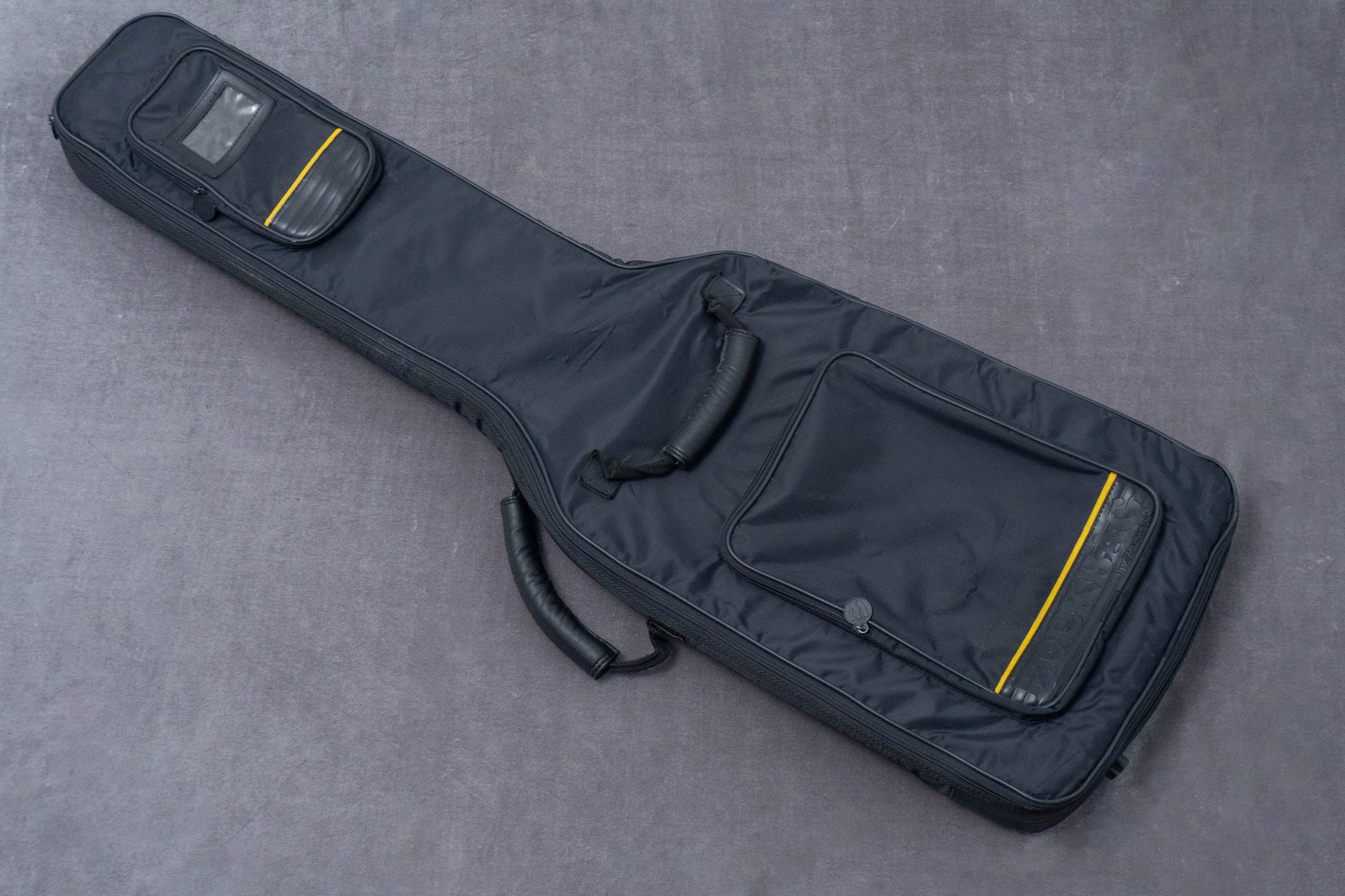 The body and finish show scattered dents and scratches overall. There is finish burn and some dullness on the hardware. There are two large sticker marks on the body bag.