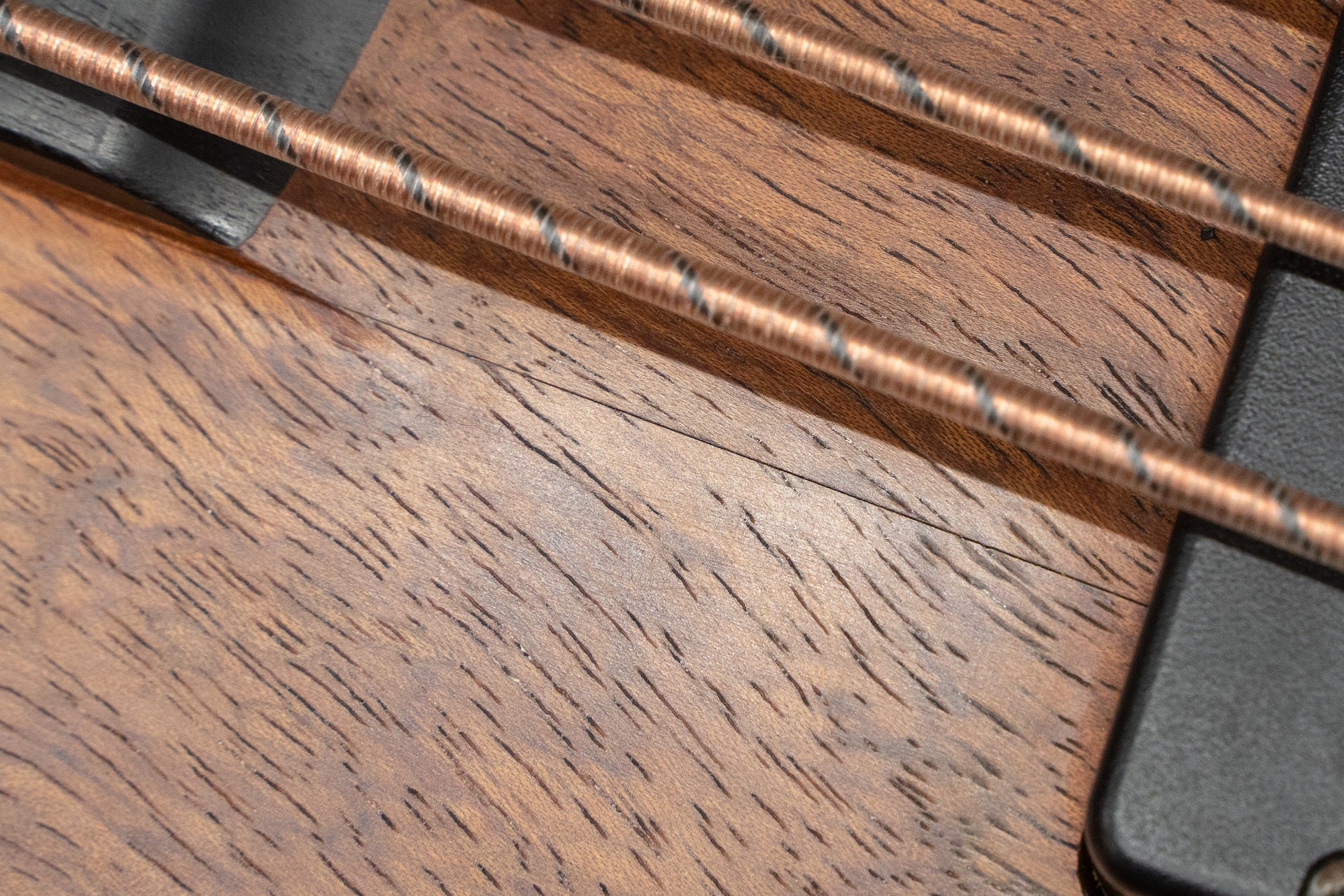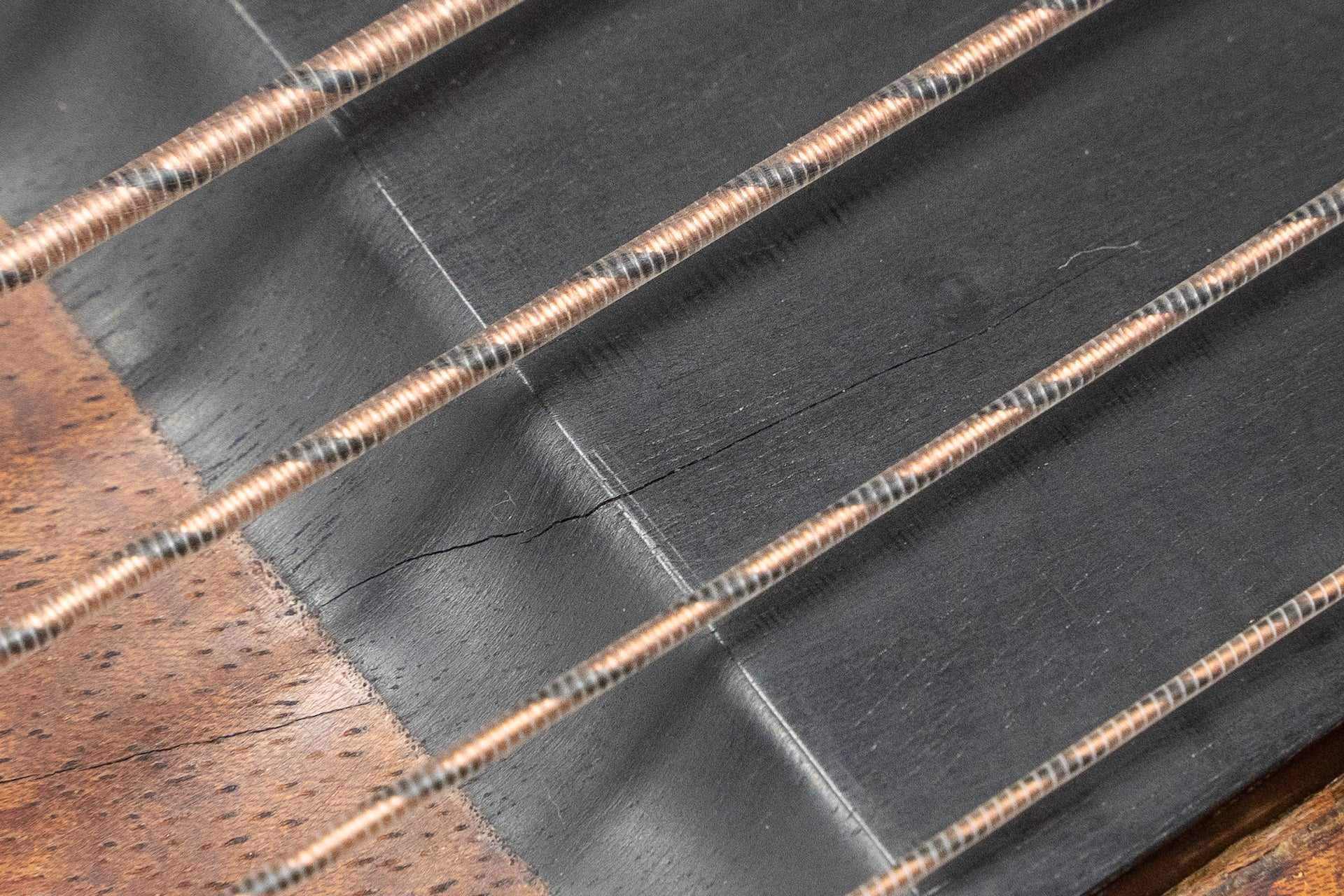 Currently it can be played without any problem by adjusting the string height to 2.3~3.3mm. A part of the nut side on the 1st string side is missing, but there is no problem at present.