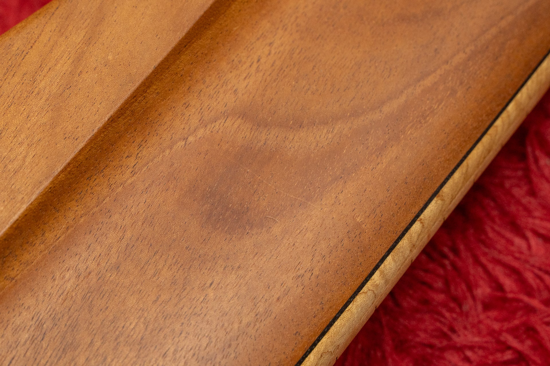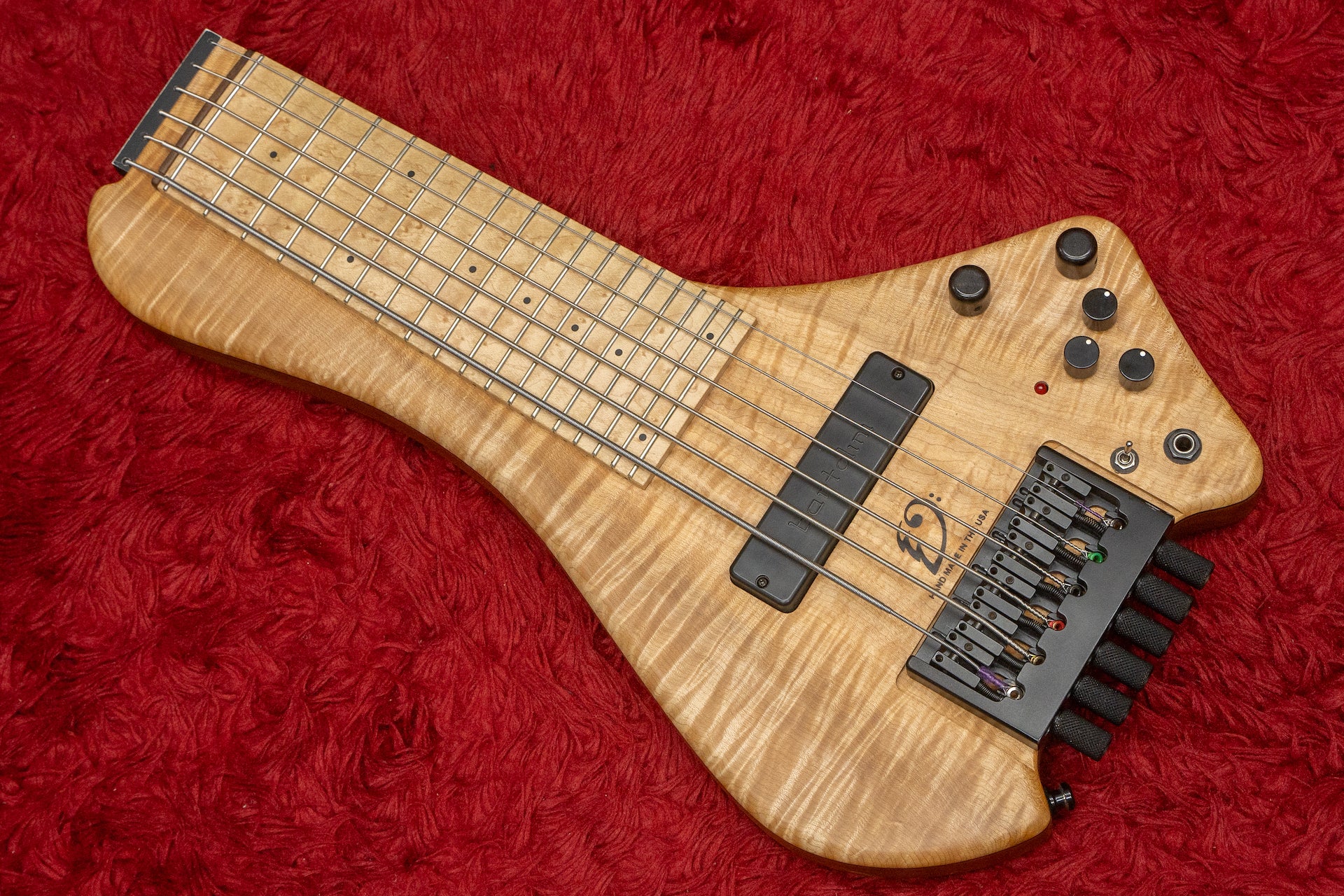 The body back is Mahogany, the body top is Flamed Maple, and the fingerboard is Birdseye Maple.