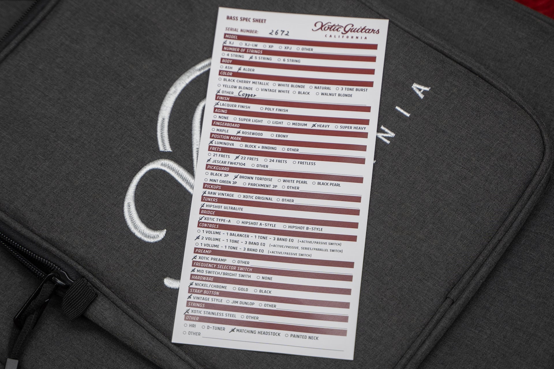 accessories:Xotic gig bag, spec sheet