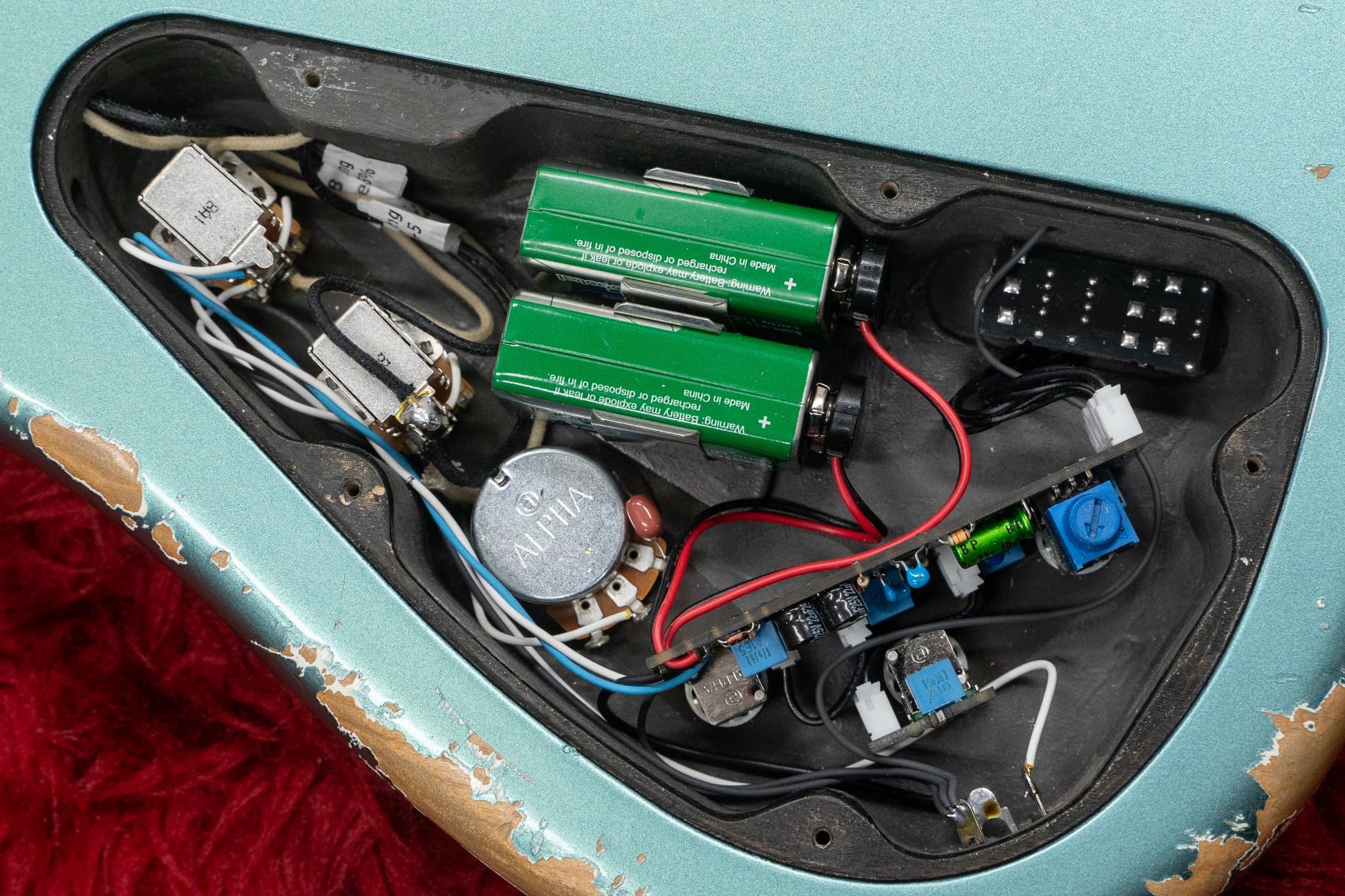 control:neck volume - push/pull (active/passive), bridge volume - push/pull (parallel/series), master tone, bass, middle, treble, middle frequency selector switch, treble frequency selector switch, preamp gain ( (inside cavity)
