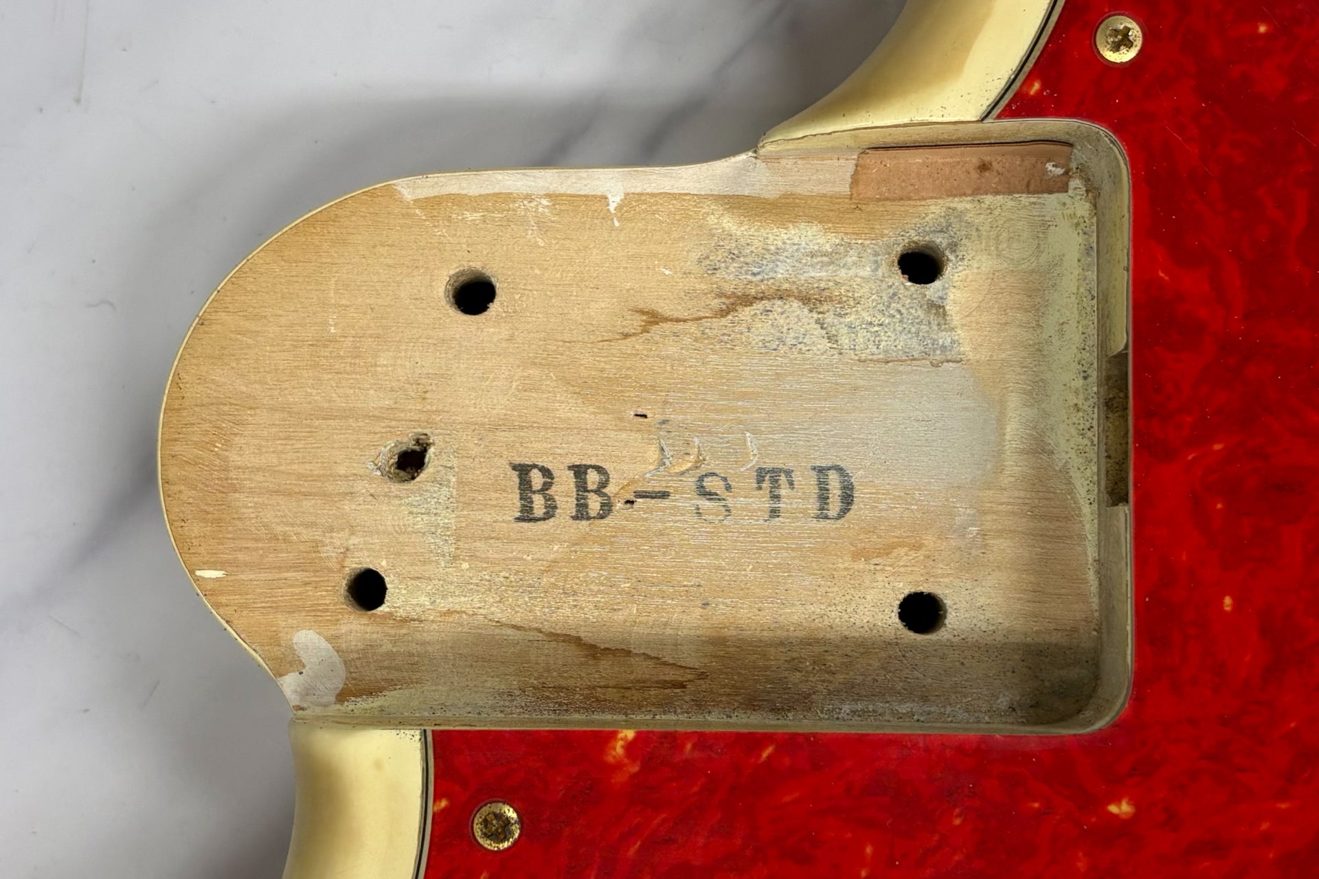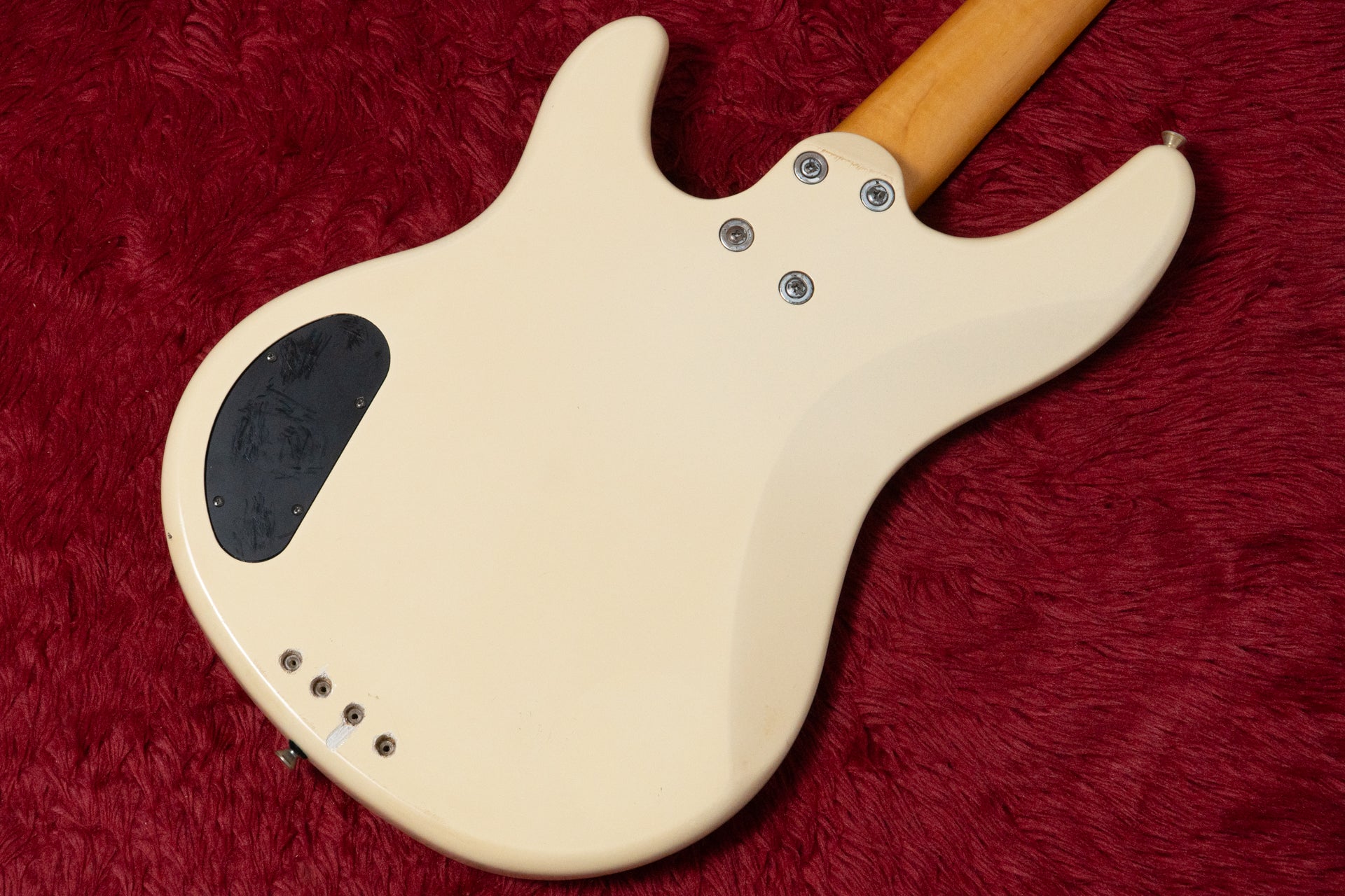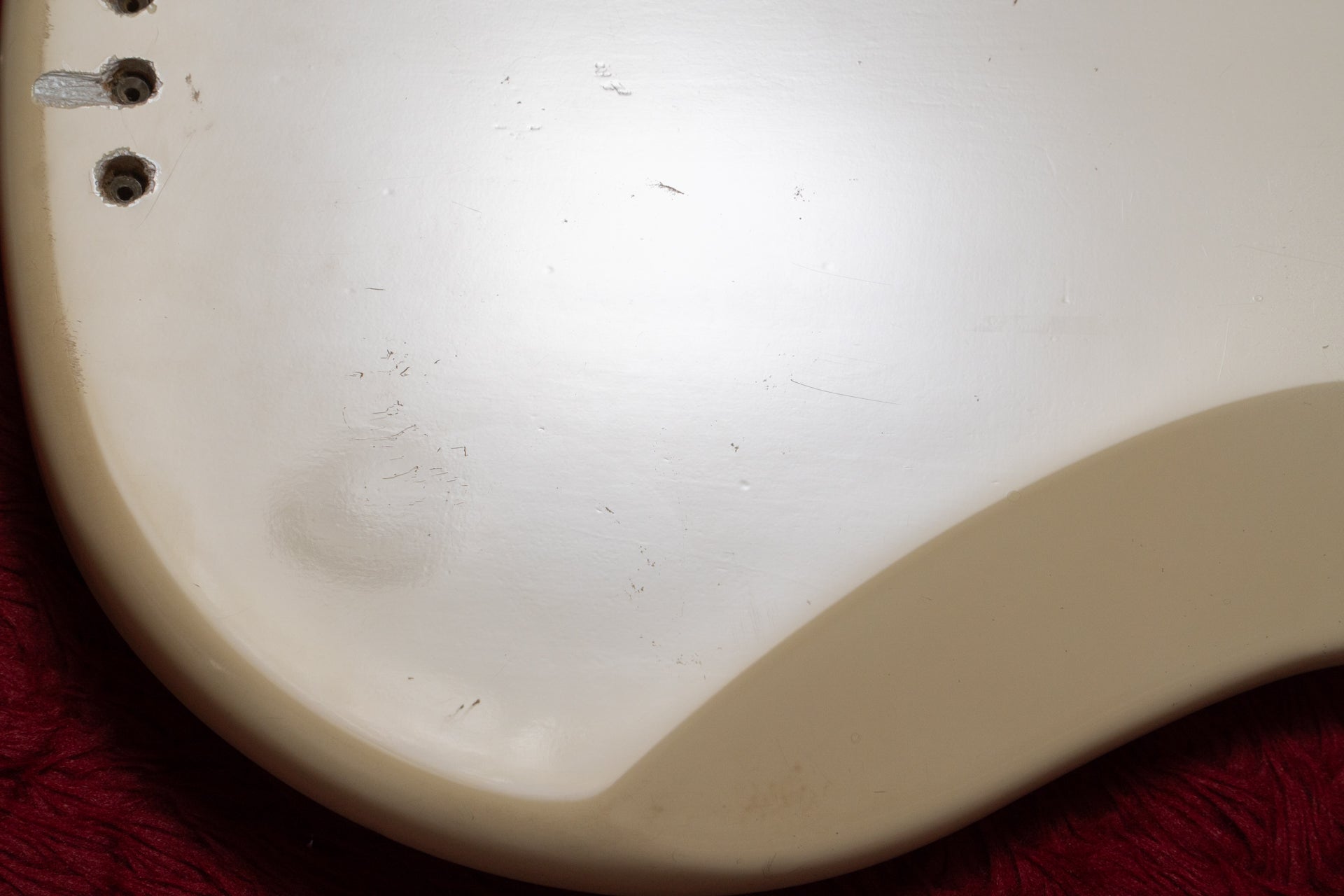 The body and finish have minor scratches and dents, and holes have been drilled near the bridge to allow for stringing through the body. There is a white stain on the pickup cover that cannot be removed.