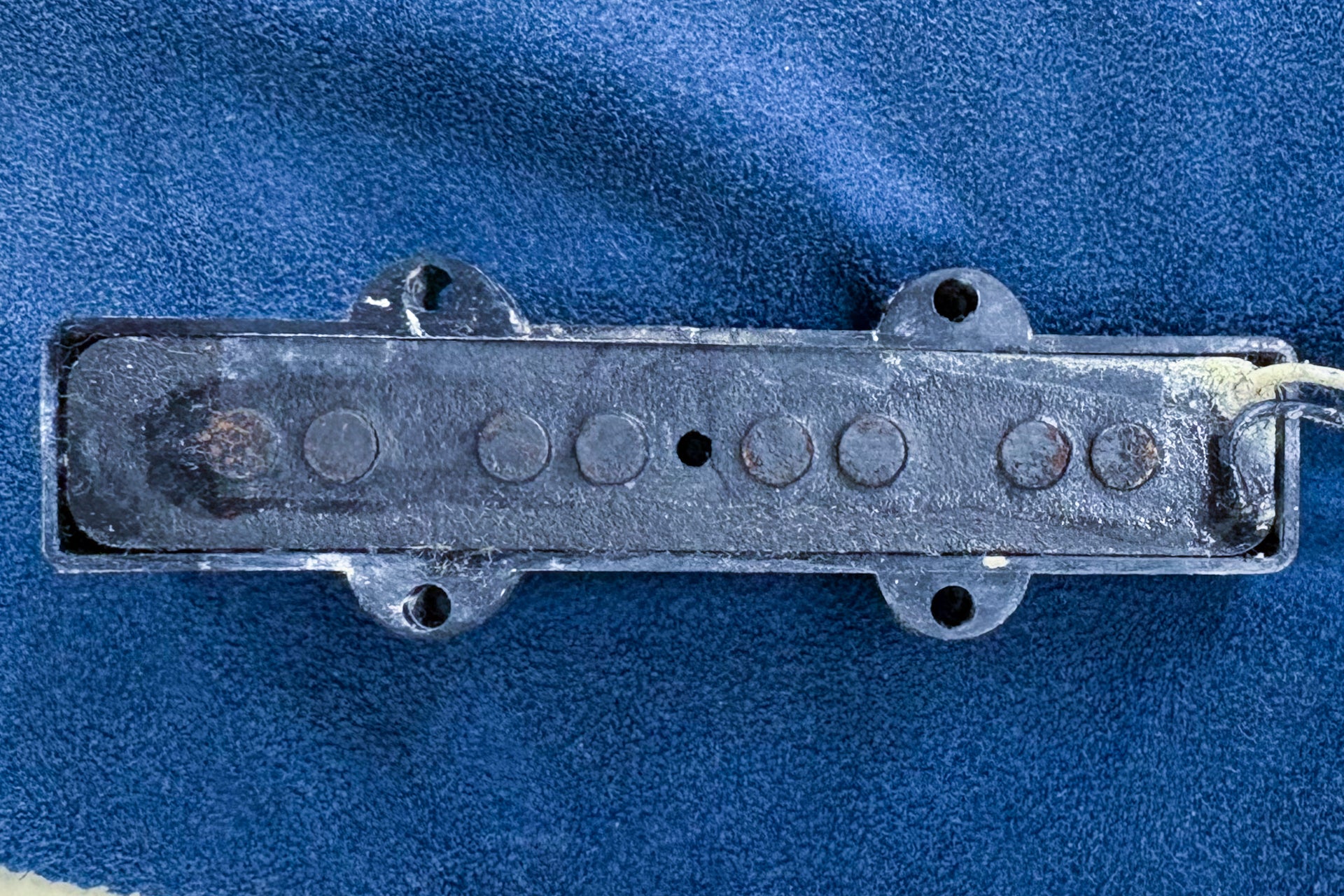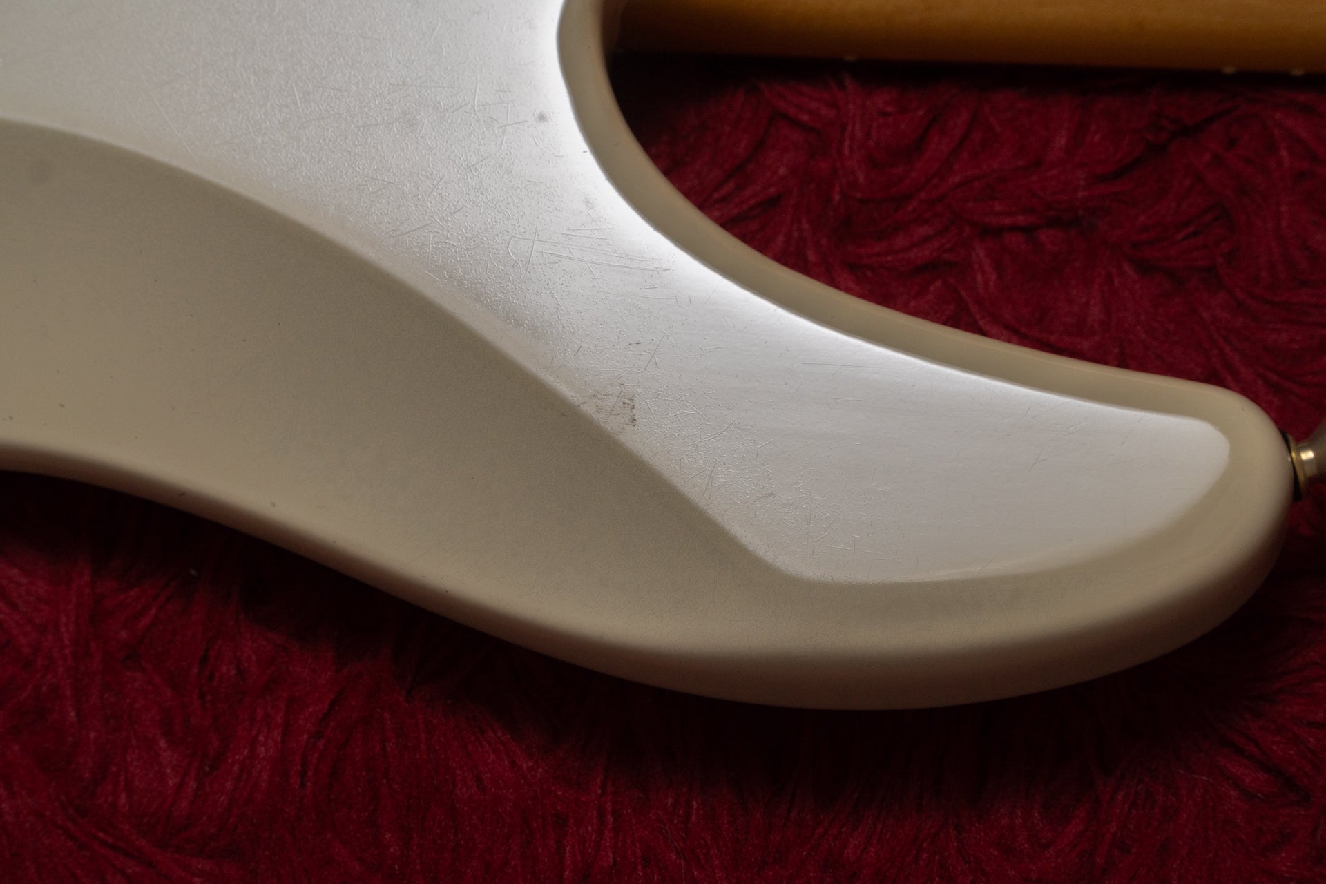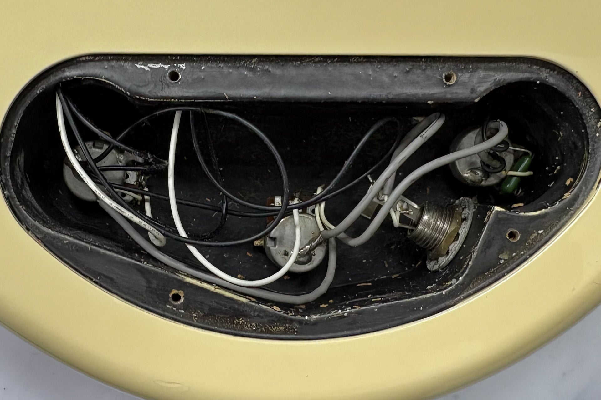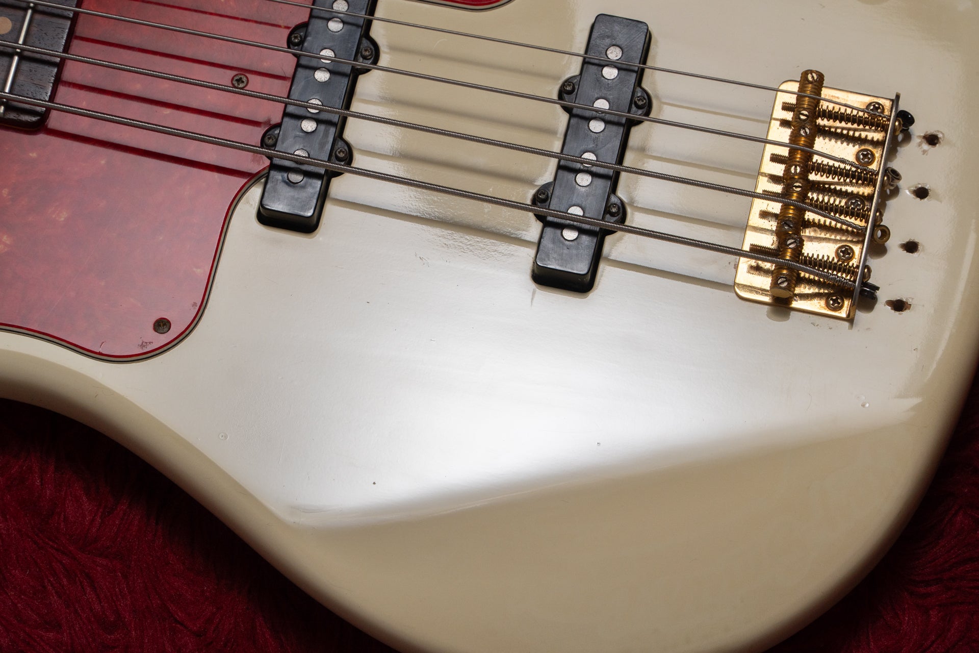 The body and finish have minor scratches and dents, and holes have been drilled near the bridge to allow for stringing through the body. There is a white stain on the pickup cover that cannot be removed.