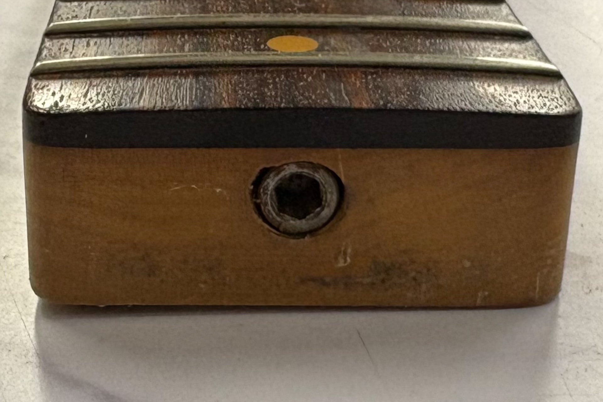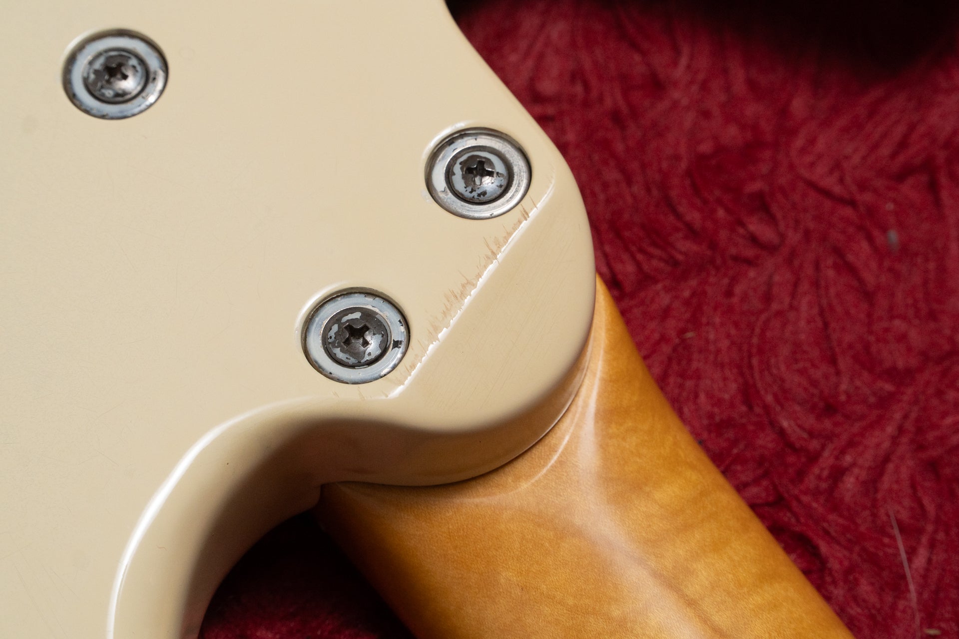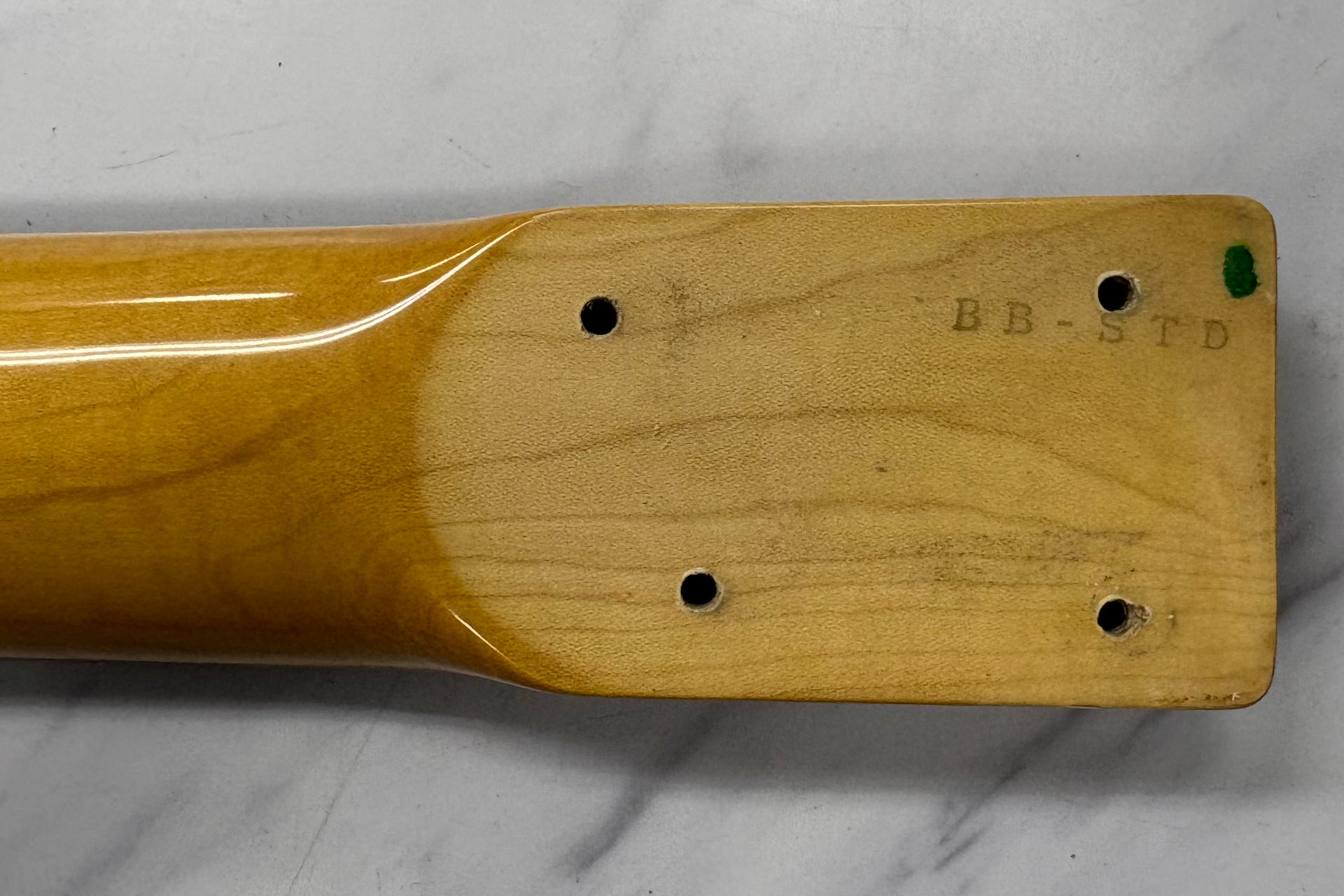 The neck is in good condition. There are three marks on the headstock that appear to be from where a string retainer was attached. These have now been filled in.